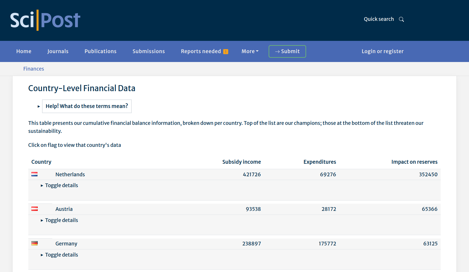 At the country-level financial data page, you will find a list of countries with associated expenditures, subsidies and how this impacts our financial reserves.