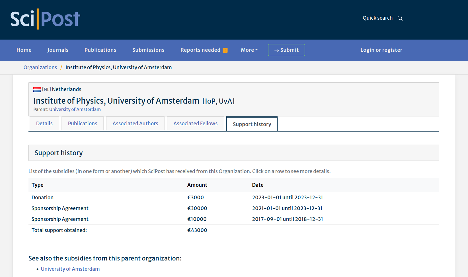 At the moment of publication, PubFracs are automatically compiled and linked to the relevant Organizations. This data is displayed on our Organization detail pages, where further relevant information can also be found (e.g. associated publications, authors, support history).