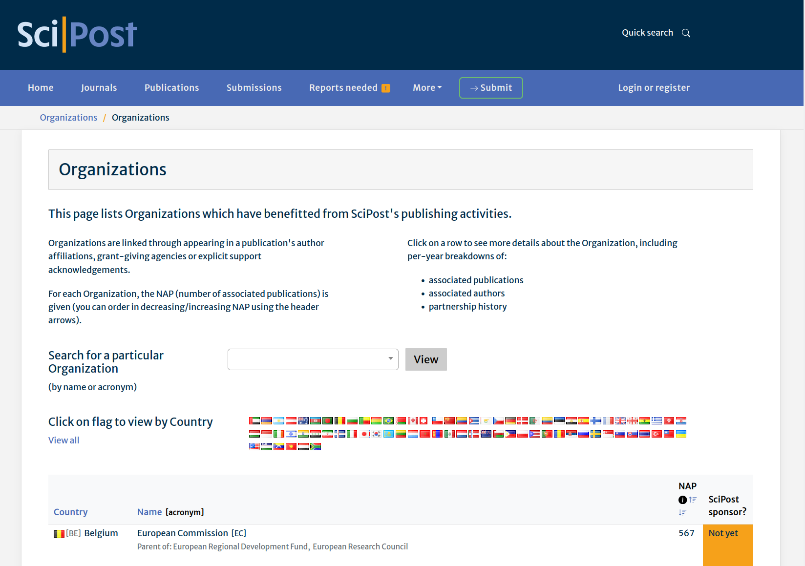 The list can be filtered by country, or by searching for a particular Organization through its name or acronym.